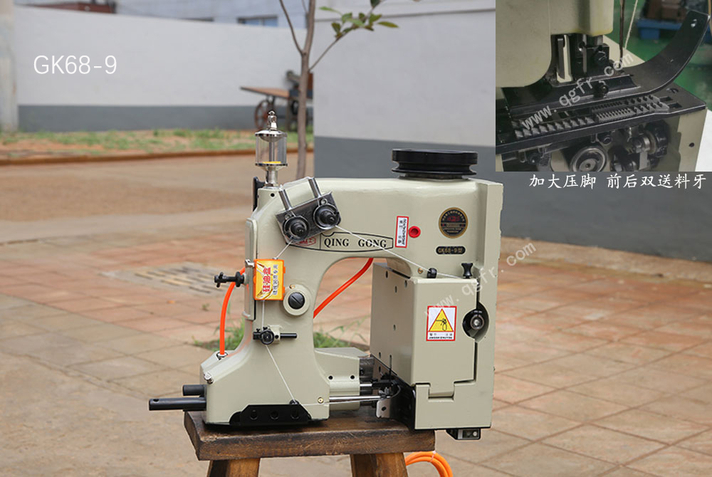 GK68-9 Extra Heavy Duty Automatic Bag Closing Machine: Specially designed for extra heavy film coated bags. With both front and back foot dog and large presser, GK68-9 can effectively avoid lobbing. Equipped with sensors and electro-pneumatically operated scissors which can obtain automatic start-stop and automatic thread cutting. Auto counting the quantity of bags is incidental function.