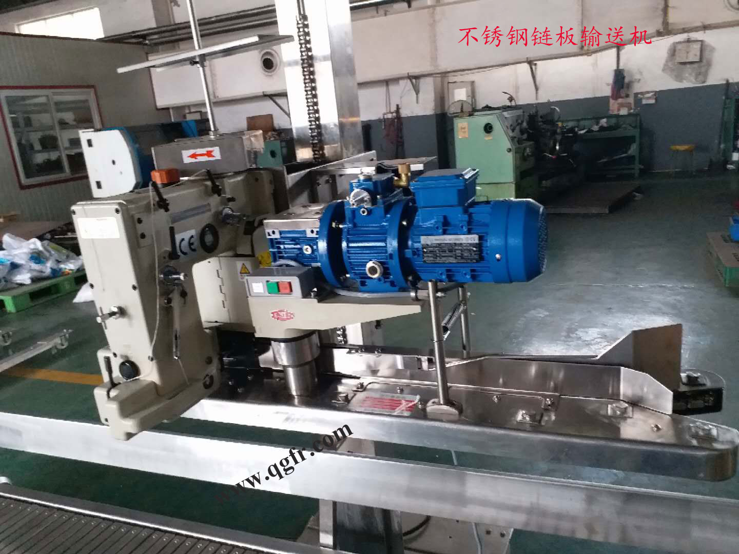 該機(jī)組由全自動(dòng)縫包機(jī)、袋子折邊機(jī)、支撐立柱、鏈板輸送機(jī)以及相配套的電控系統(tǒng)組成,輸送機(jī)、支撐立柱、電控箱、折邊機(jī)均采用不銹鋼材質(zhì),適用于食品、化工等行業(yè)對(duì)設(shè)備材質(zhì)有特殊要求的場(chǎng)合。(注:由于縫包機(jī)零件結(jié)構(gòu)復(fù)雜,而不銹鋼難以加工,暫時(shí)尚沒(méi)有不銹鋼形式的縫包機(jī))